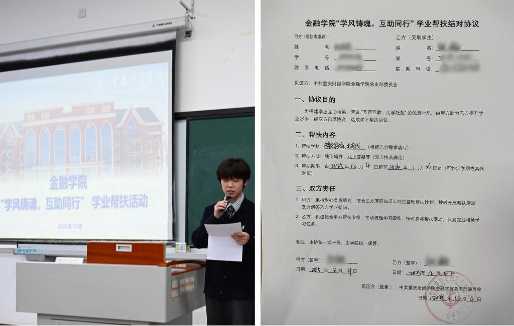 为深入推进学风建设,营造“比学赶超、互帮互助”的优良学习风气,重庆财经学院金融学院于2025年12月4日成功举办“学风铸魂,互助同行”学业帮扶活动。本次活动通过系统筹备与丰富互动,影响范围覆盖全院,有效促进了优良学风的形成。