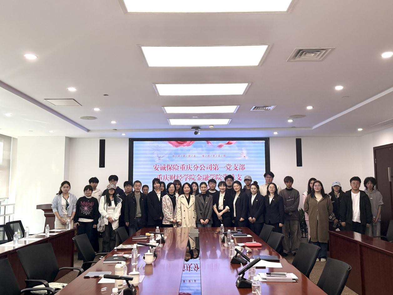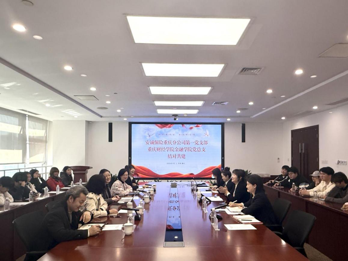 为深化党建引领产教融合,推进保险学专业认知实习与实践育人落地,2026年3月11日下午14:30,安诚保险重庆分公司与重庆财经学院金融学院在安诚保险重庆分公司613会议室开展结对共建活动。本次活动由安诚保险重庆公司党委委员、工会主席、第一党支部书记张力元,重庆财经学院金融学院党总支书记张玉华、副院长李静带队,双方校企代表及25级保险学专业20名学生共同参与,围绕党建结对共建、校企协同育人、25级新生专业认知实习等议题深入座谈。