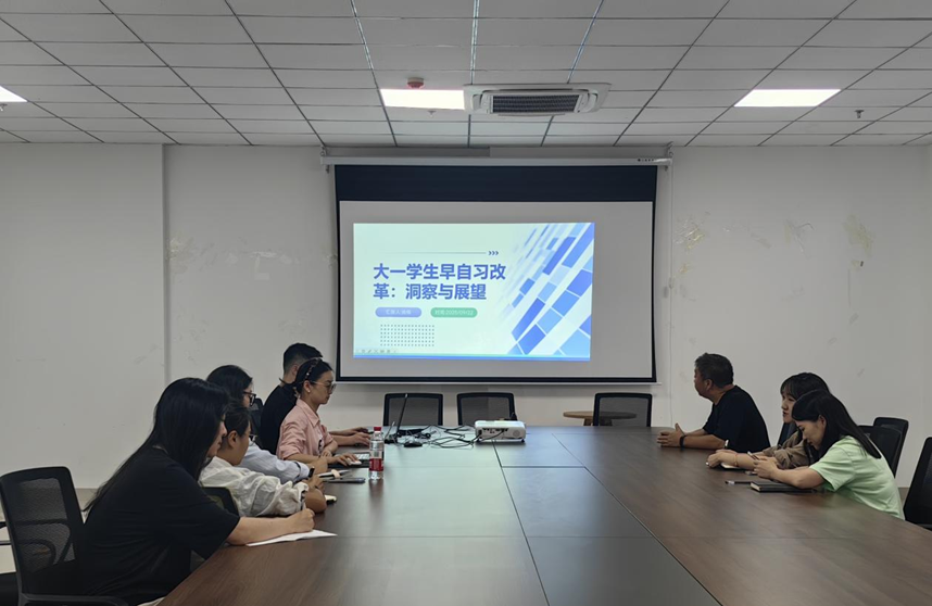 会议首项聚焦早自习改革 —— 该工作已由24级辅导员团队率先推进,形成课堂出勤、早自习参与度、学生满意度等一手数据。会上,尚栋老师作专题报告,阐述改革背景、路径及成效(24级学生改革后满意度提升20%+);马秋婵老师补充分层督导、个性化辅导等实操细节。