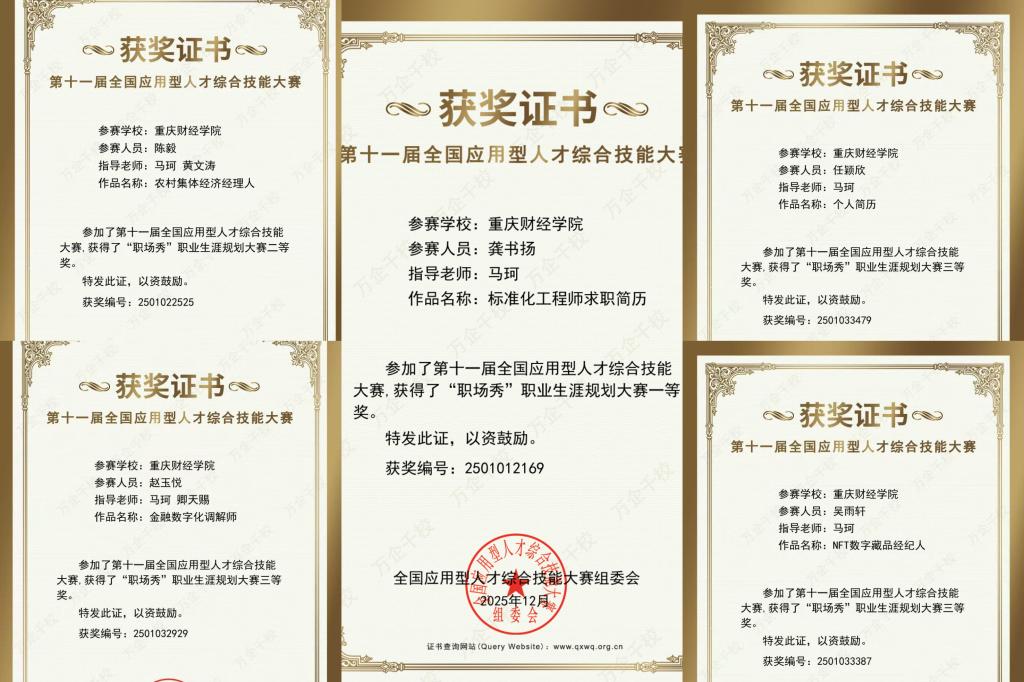 近日,第十一届全国应用型人才综合技能大赛“职场秀”职业生涯规划大赛全国总决赛落下帷幕。这场汇聚了全国多所高校优秀学子的赛事中,金融学院FinTech研习室的同学们带着精心打磨的职业规划作品出征,最终凭借前沿的专业视角、清晰的职业成长路径、生动的场景化展示,在数百份参赛作品中脱颖而出,一举拿下1项一等奖、1项二等奖、3项三等奖的亮眼成绩!